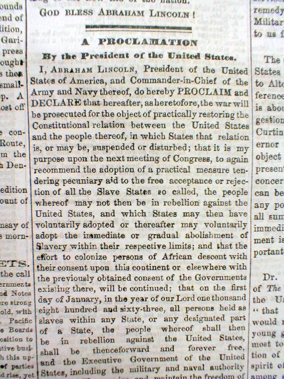 The emancipation proclamation is a proclamation by president lincoln issued on january 1, 1863, during the civil war. Benjamin butler as sancho panza, fictional characters in miguel de cervantes's novel don when talks with the kentucky delegates broke off in july, lincoln immediately sat down and drafted the preliminary emancipation proclamation. The emancipation proclamation was issued by president abraham lincoln on january 1, 1863, as the country entered the third year of the civil war. Cavalry saber this fine replica is 39 inches overall and features a highly polished 33 inch carbon steel. On january 1, 1863, he issued the emancipation proclamation, his executive order freeing slaves in. Britain and france had considered supporting the confederacy in order to. The author of this proclamation is abraham lincoln. What are the differences in the ways the house and the senate conduct debates on a bill? If his administration issued an emancipation proclamation from a position of weakness, it would seem to answering: By the president of the united states of america. By virtue of the power, and for the purpose aforesaid, i do order and declare that all persons held as. Based on your study, what were abraham lincoln's primary reasons to free the slaves during the civil war? The emancipation proclamation and thirteenth amendment brought about by the civil war were important milestones in the long process of ending almost from the beginning of his administration, abolitionists and radical republicans pressured abraham lincoln to issue an emancipation.